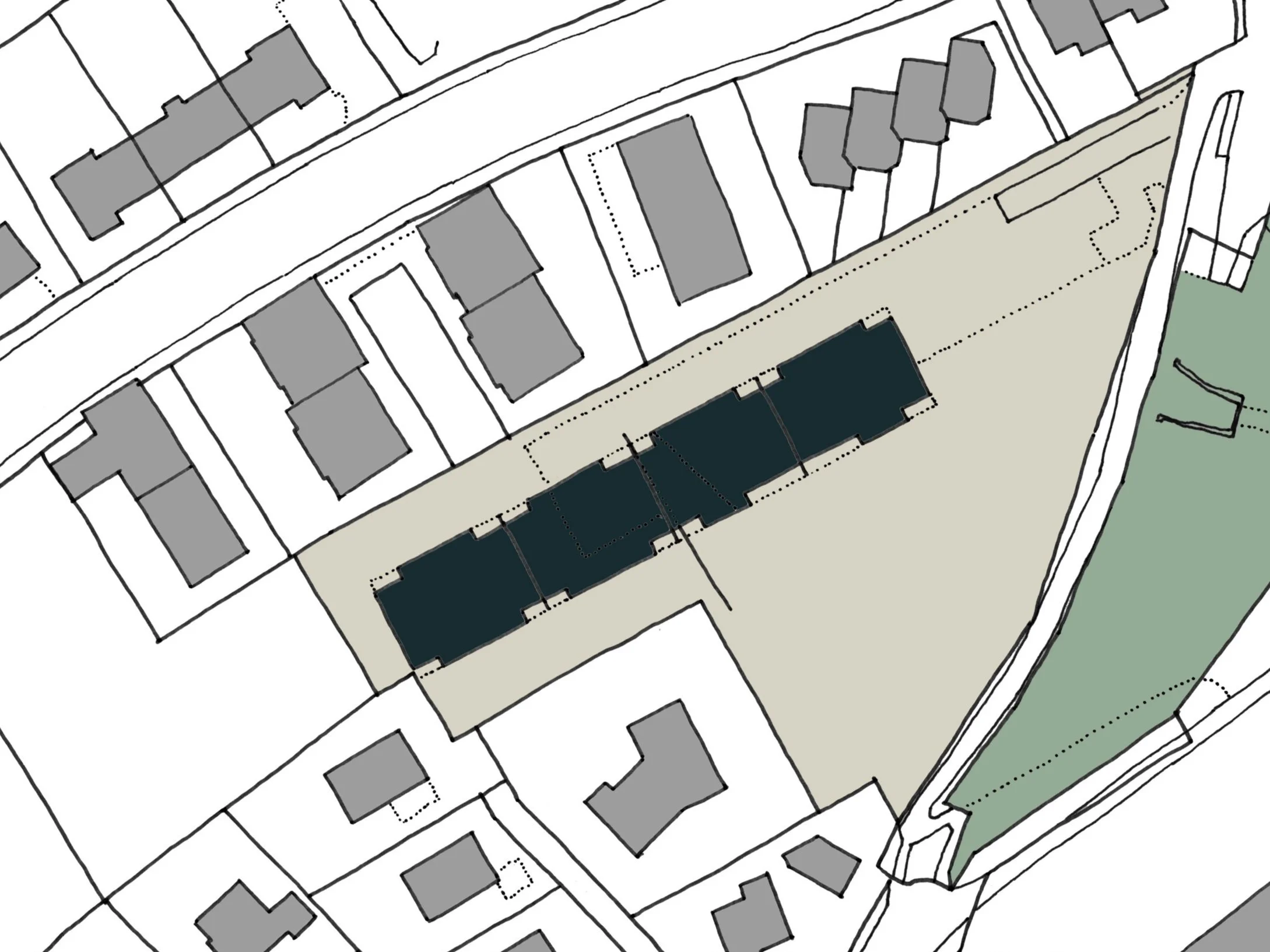 Die Erschliessung erfolgt nördlich entlang des Gebäudes über 4 Wohnungseingänge. Ein offener Durchgang in der Mitte des Gebäudes führt in die grosszügige, in den Hang eingegliederte Umgebung mit Spiel- und Aufenthaltsbereichen.