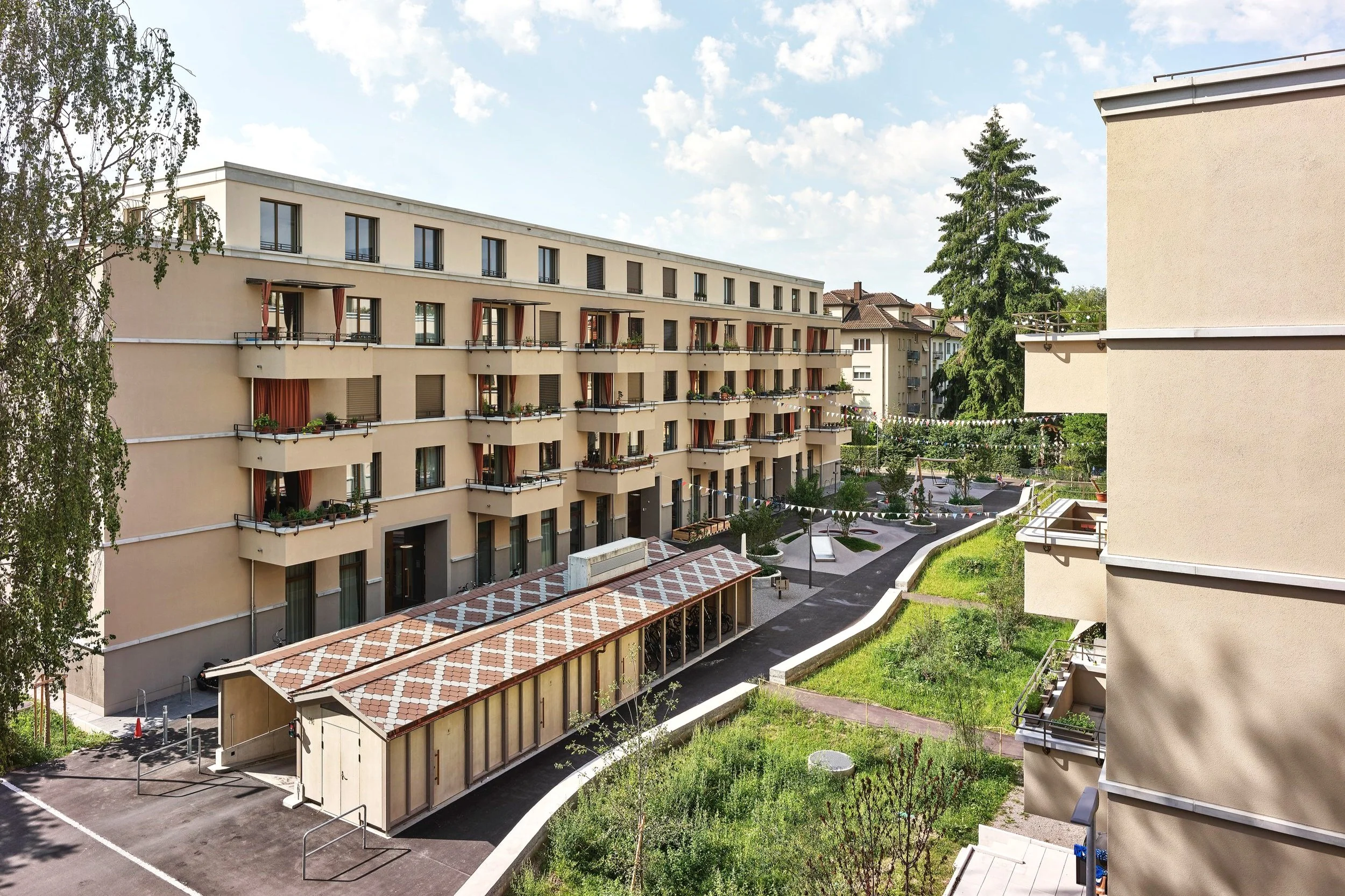 Ein abgesetzter Gebäudesockel, horizontale Betongesimse sowie Hochparterrewohnungen tragen weiter zur passenden Identität bei.