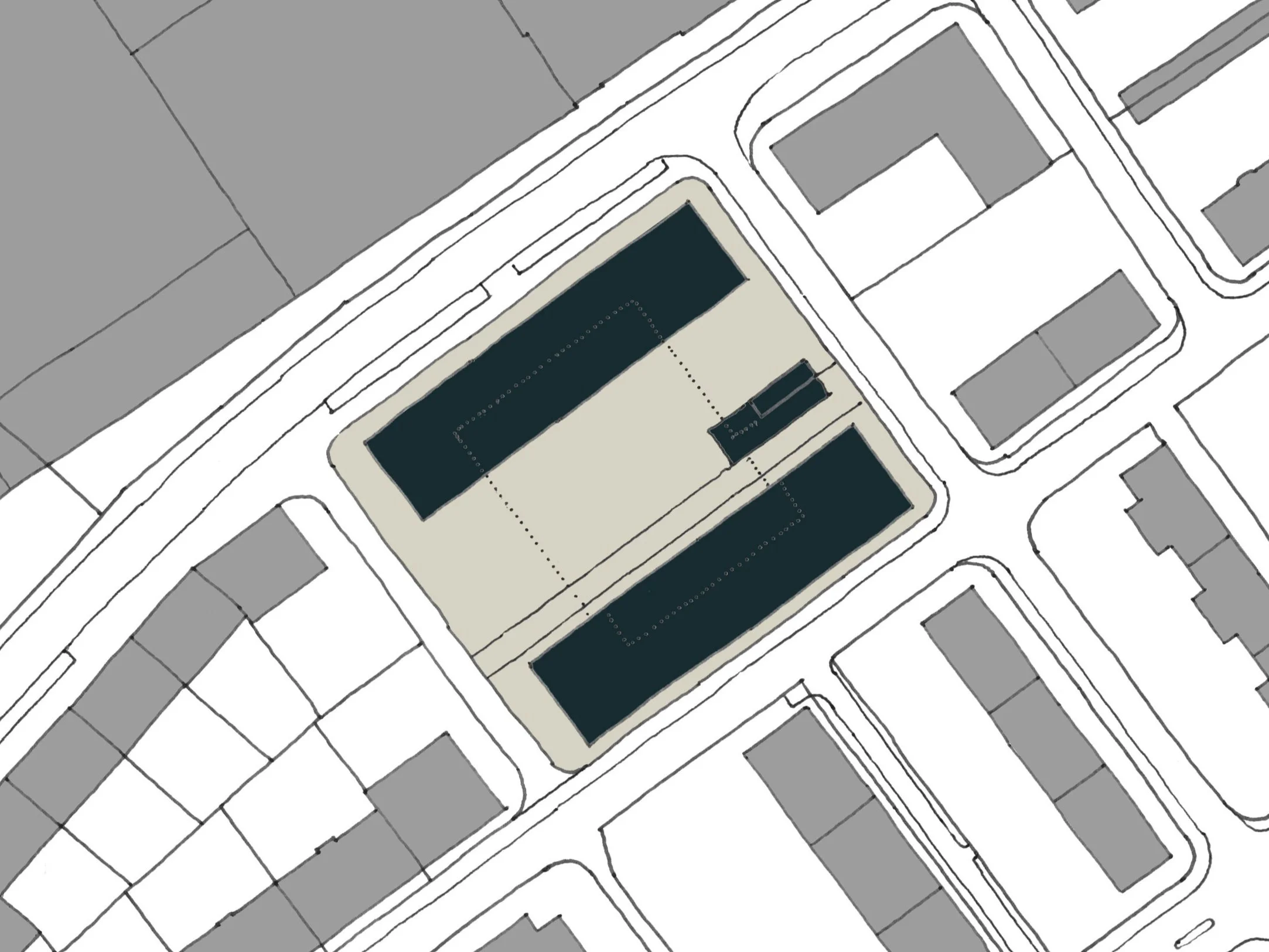 Die beiden Baukörper nehmen vorhandene Quartierstrukturen auf und interpretieren diese neu. Die beiden Gebäude fügen sich passgenau in die bestehenden Gebäudefluchten ein und bilden dazwischen einen grünen, belebten Innenhof.