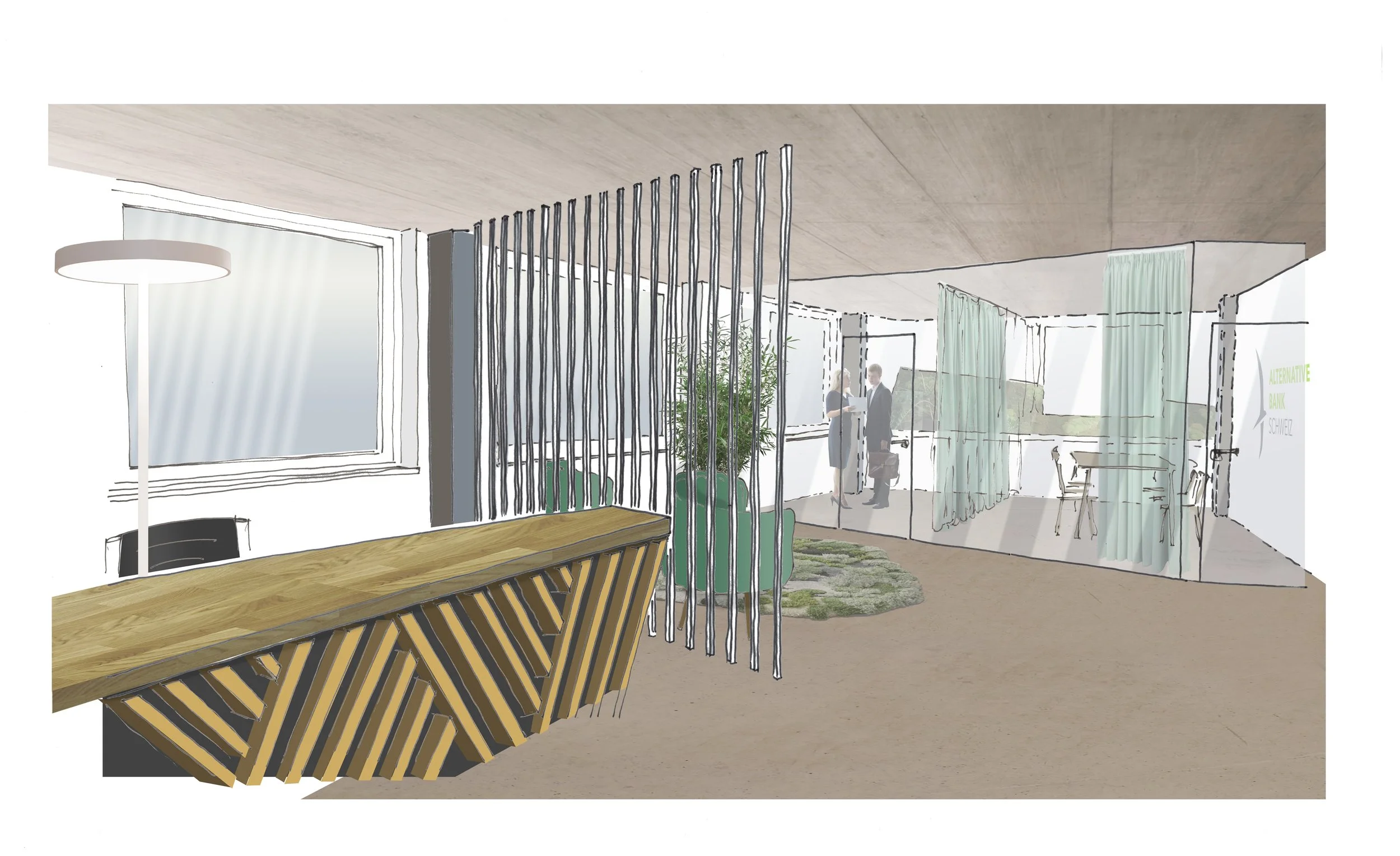 Innenraumstudie Bank Zürich ZH Wettbewerb Doppelkindergarten Rüti ZH Ideenstudie Umbau Einfamilienhaus Seengen AG