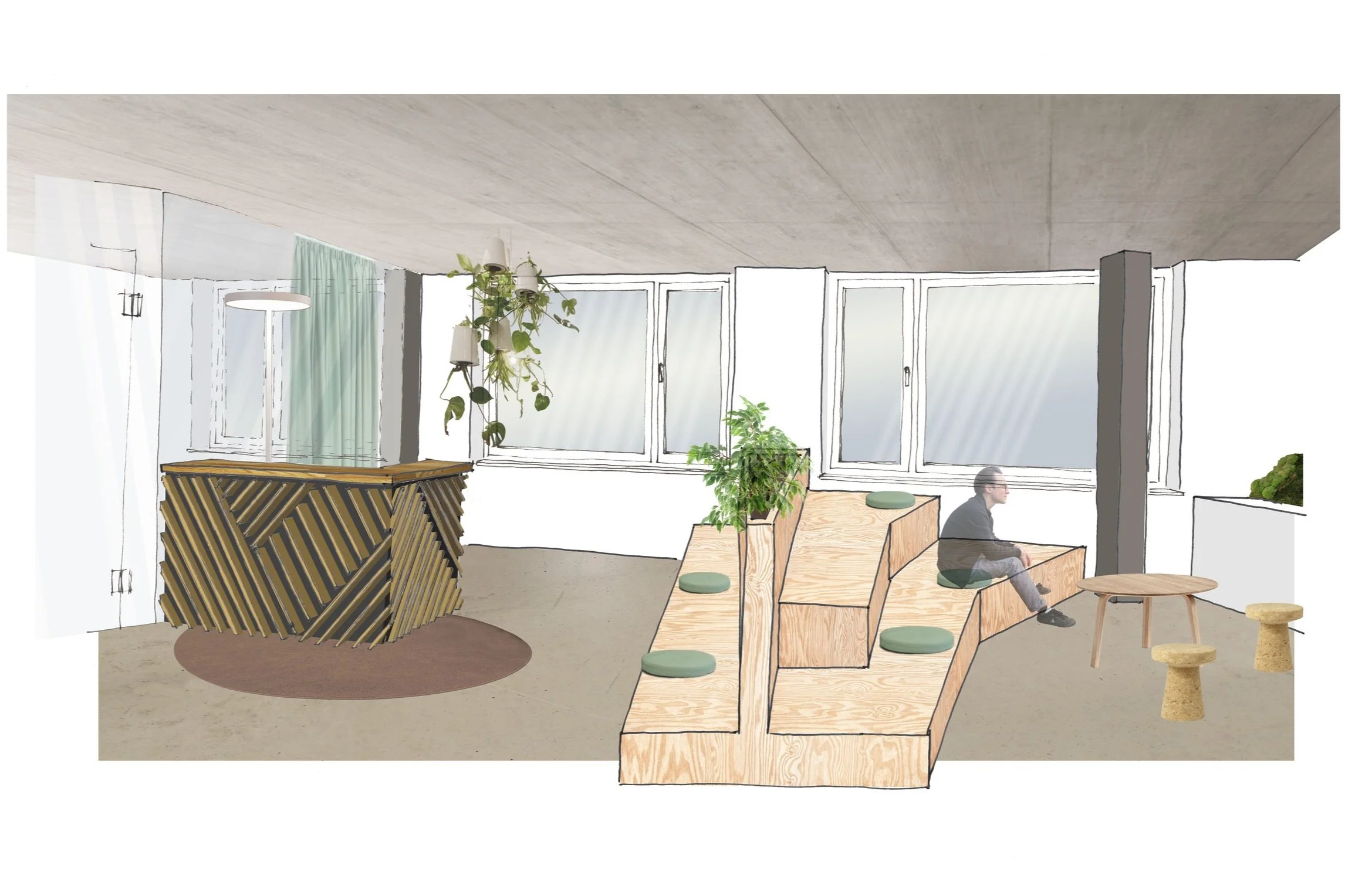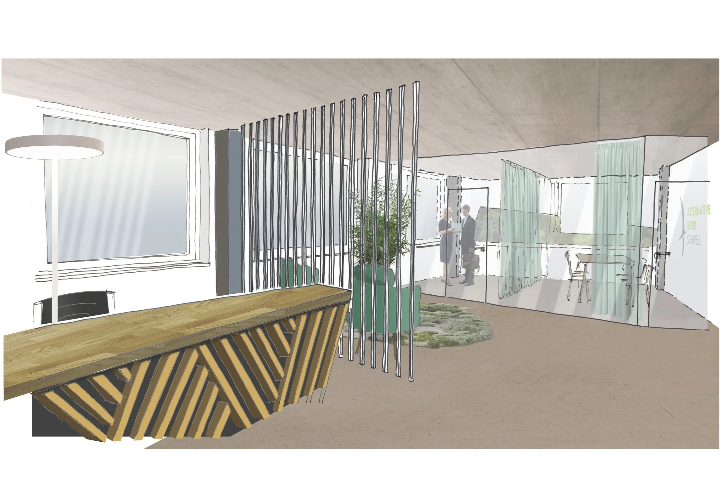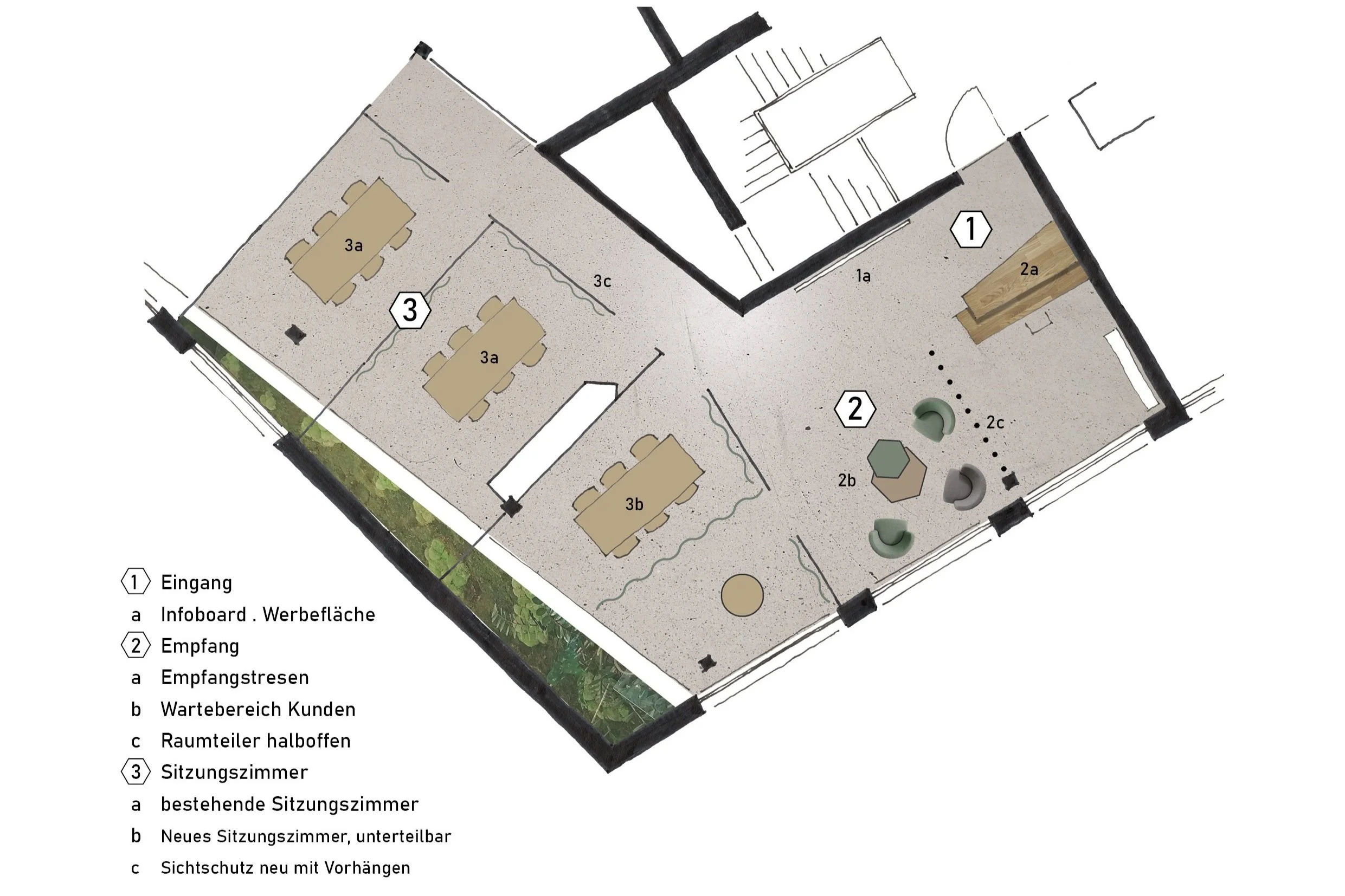 Mit einer minimalen Eingriffstiefe wurde der bestehende Empfangsbereich verkleinert und durch wahlweise mobile oder feste Raumteiler ein zusätzlicher Aufenthaltsraum geschaffen. Der feste Raumteiler in Holz soll als multifunktionales Element den Raum beleben. Ein weiteres Sitzungszimmer beim Eingangsbereich bietet weitere Rückzugsmöglichkeiten.