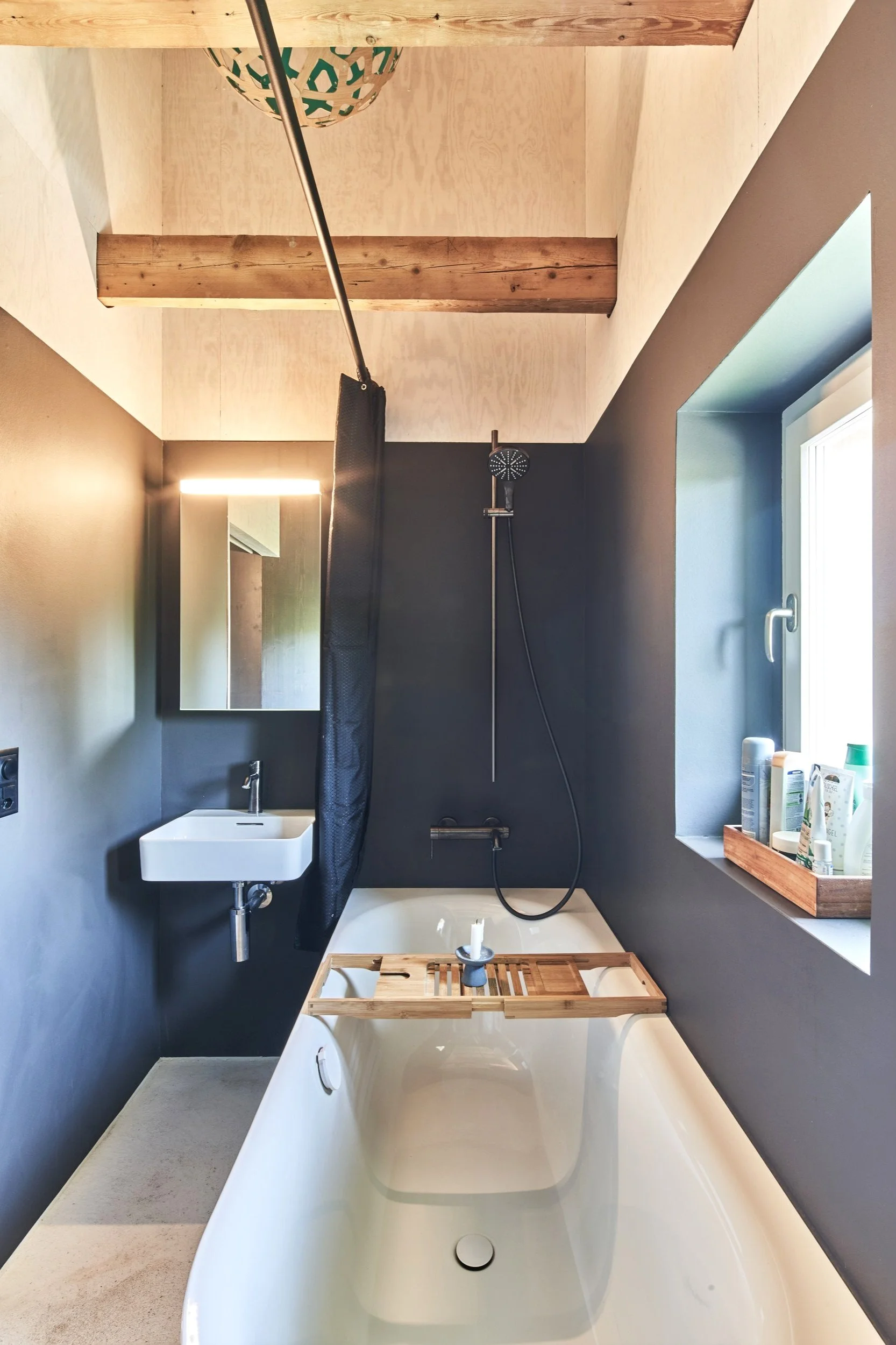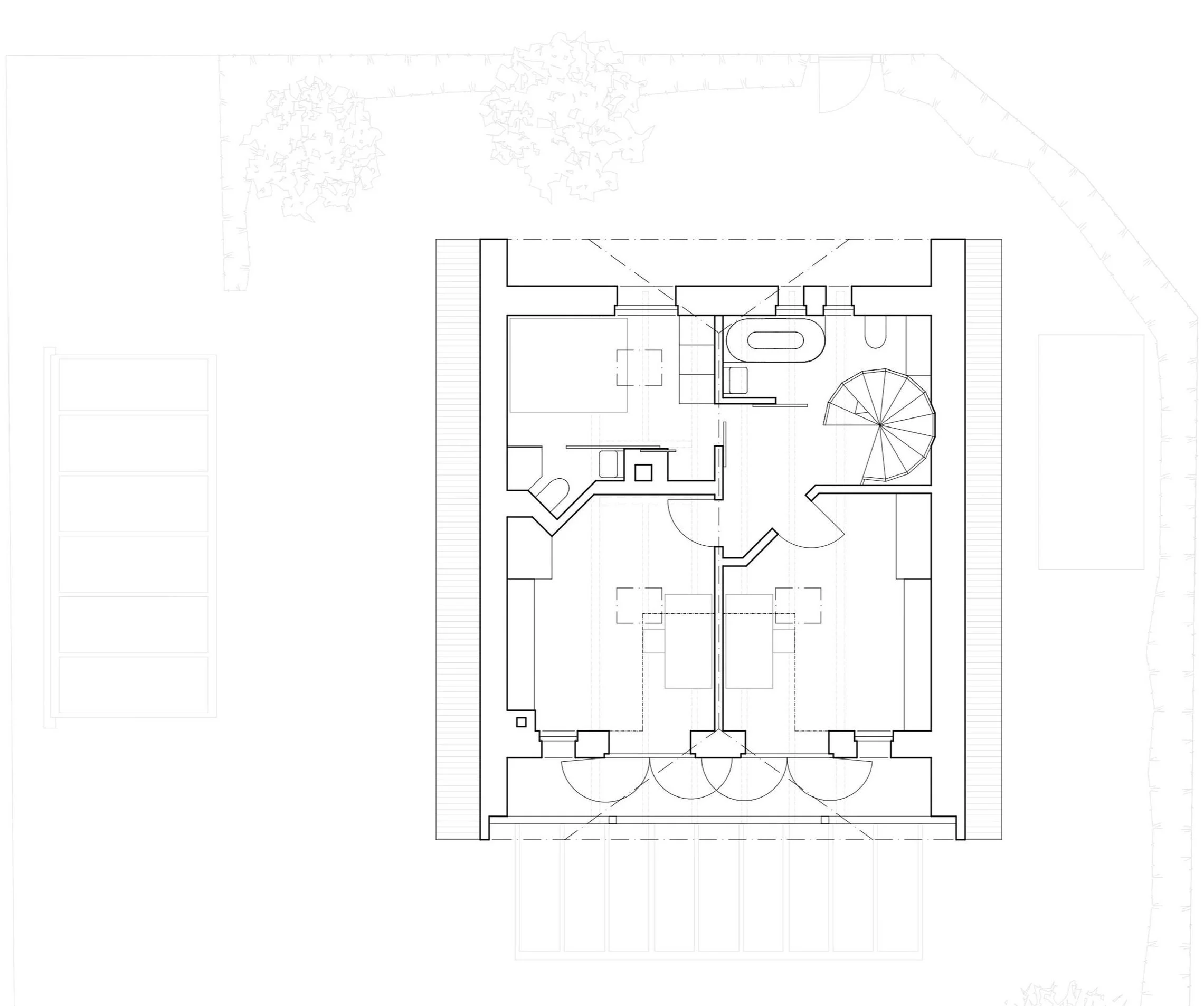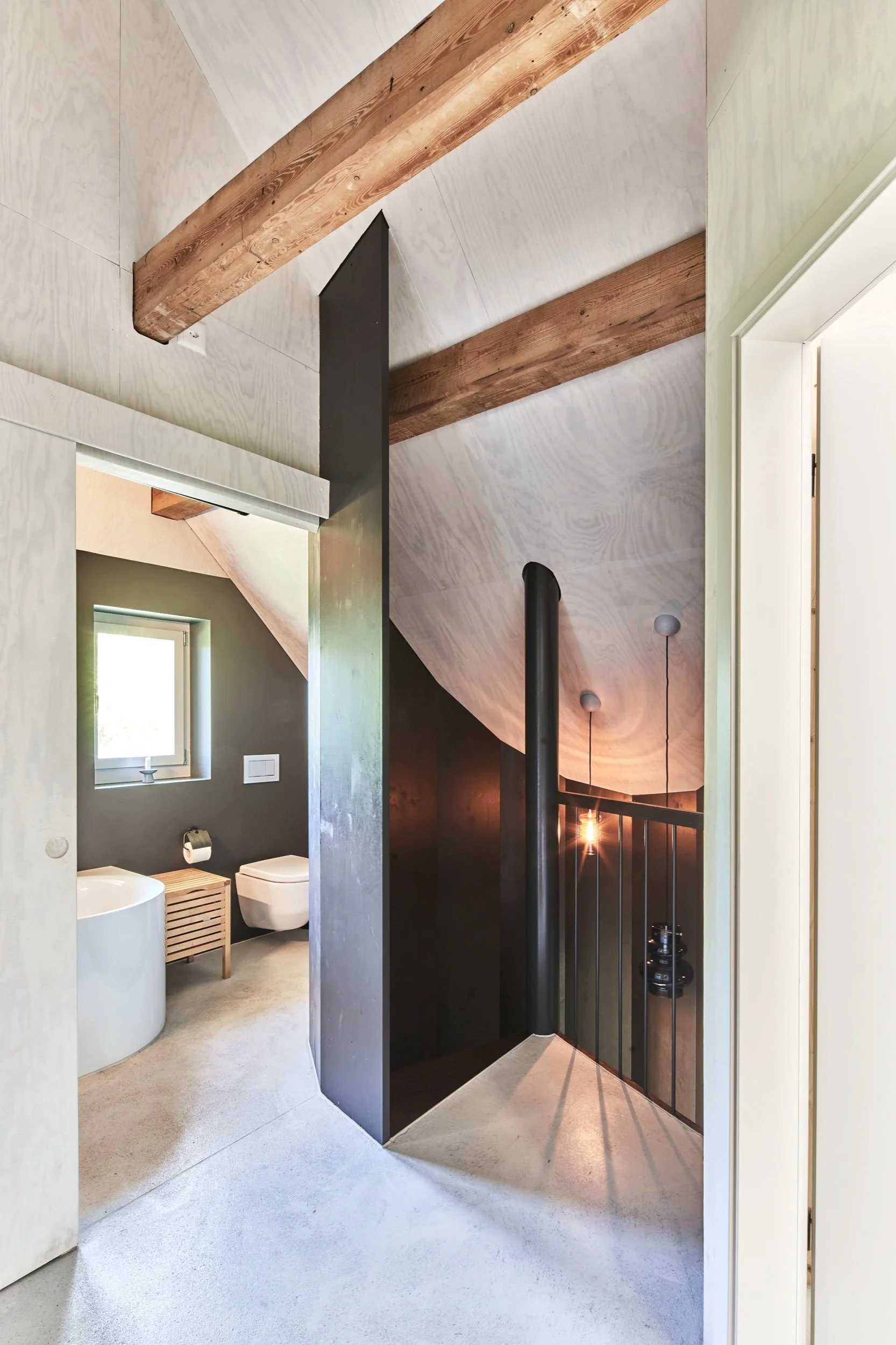 Über eine dunkle, skulptural inszenierte Wendeltreppe gelangt man ins Obergeschoss. Die drei Zimmer, das Bad sowie ein Separat-WC im Elternschlafzimmer wurden durch eine clevere Anordnung möglichst raumgewinnend eingebaut. Die Wände und Decken im Obergeschoss wurden mit lasierten Seekiefer-Schälfurnierplatten verkleidet, was den hohen, verwinkelten Räumen eine besonders lebendige Optik verleiht. Die Schälfurnieroptik wurde im Erdgeschoss auf den Einbaumöbeln sowie der Küche wieder aufgenommen und farblich akzentuiert.