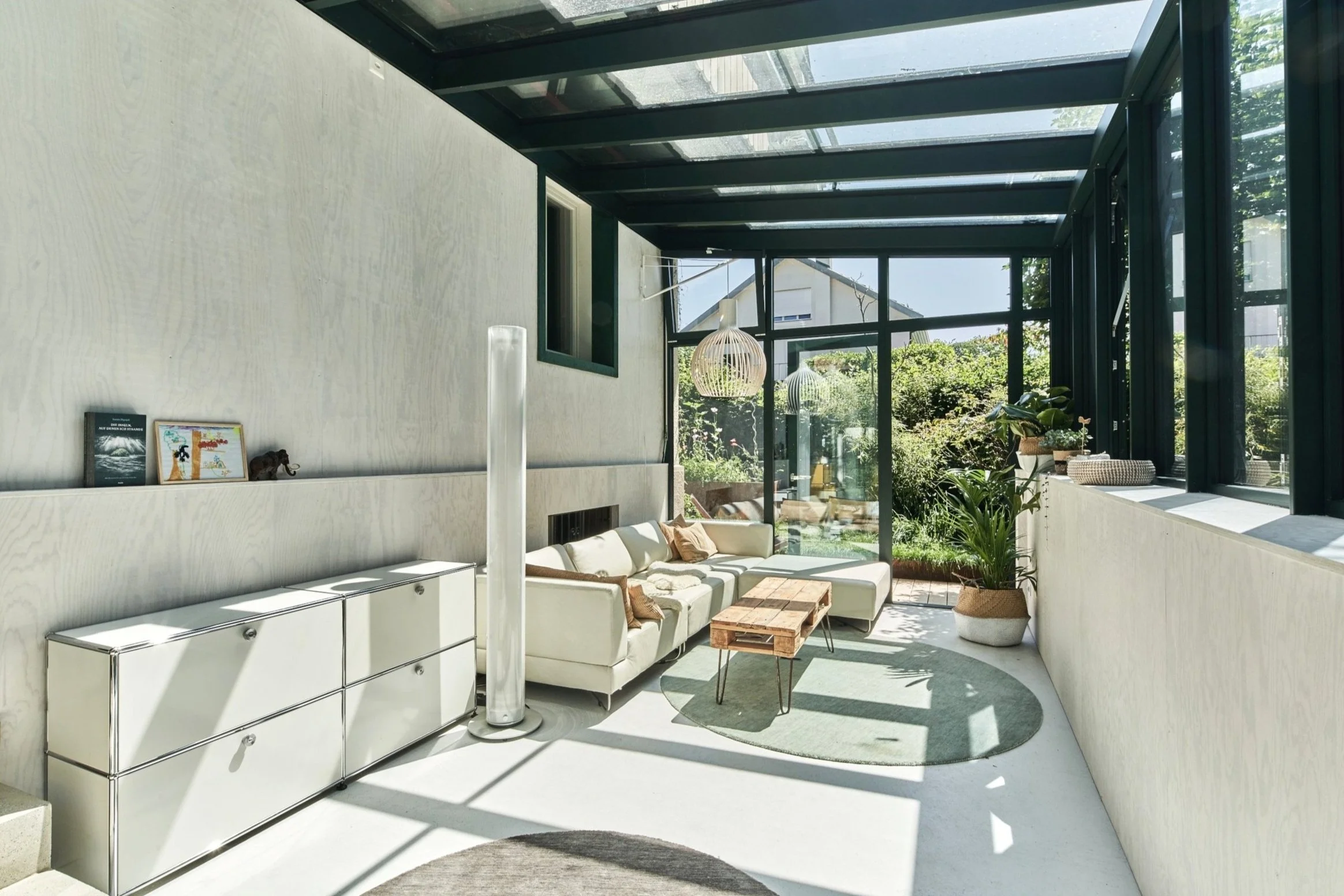 Das im malerischen Eichholzquartier unweit der Aare gelegene Einfamilienhaus aus den 1920er-Jahren wurde komplett entkernt und offener strukturiert, um genügend Wohnraum für die 4-köpfige Familie zu generieren. Das Erdgeschoss erscheint neu als einen Raum, welcher durch die neu eingebauten statischen Elemente offen unterteilt wird. Durch einen Anbau im Stil eines Gewächshauses geht der Wohnraum nun fast fliessend in den Garten über.